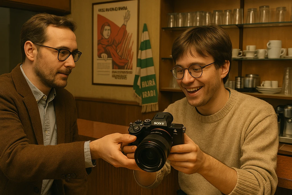 – Na és ehhez mit szólsz? – kérdezte ekkor Balog Jenő, és az öblös váltáskájából elővett egy kissé megkopott, de kétségtelenül 2025-ös csúcsmodel Sony MILC fényképezőgépet.
