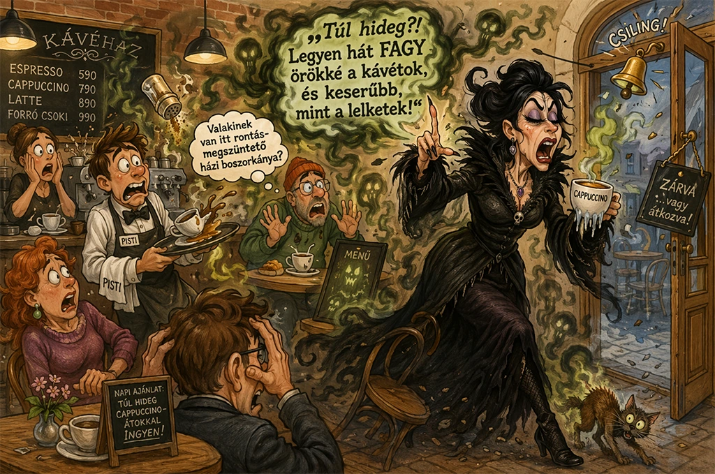 Pisti, ugye, intézkedtél? Van nekünk rontáslevételben jártas házi boszorkányunk, vagy legalább valaki, aki nagytakarítás közben szentelt vízzel is felmossa a pult környékét? Mert ha nincs, akkor sürgősen hirdetést kell feladni: „Kávéház átoktalanításához gyakorlott boszorkányt keresünk. Elvárás: demonológiai alapismeret, cappuccino-kompatibilitás, azonnali kezdés.”