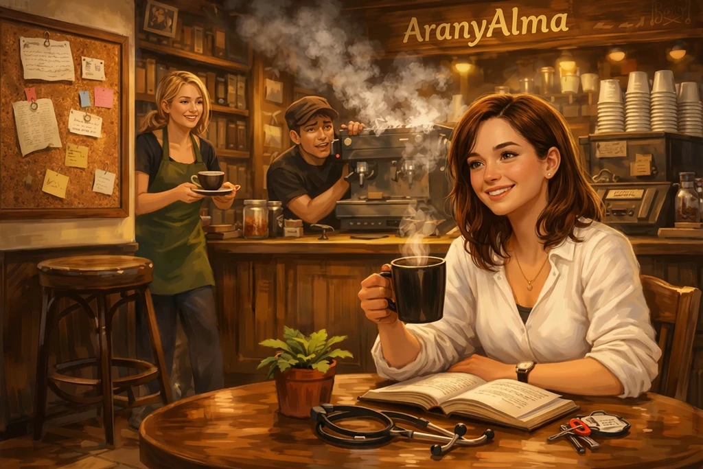 A sikeres vizsga, mint minden apró öröm az életben, megünnepelendő, ezért az egyetem épületéből kilépve egyenesen az AranyAlma kávézó felé veszi az irányt. Imádja ezt a helyet, bár nem tudná megmondani, miért. Mielőtt a városba került, nem volt nagy kávéfogyasztó, mindig is túl keserűnek, földesnek találta az ízét. De az egyetem, a stressz és a megszokott életből való kiesés megváltoztatja az embert. Most már gyakorlott törzsvendégként lépi át a küszöböt, és élvezi, ahogy az arcát megcsapja a helyiséget betöltő frissen pörkölt kávé és öreg könyvek illata. Laura, a mindig mosolygós felszolgáló köszönti az ajtóban, Barista Pisti pedig a pult mögül. Mindkettőjüket jól ismeri, még a szaktársainál is gyakrabban látja őket.