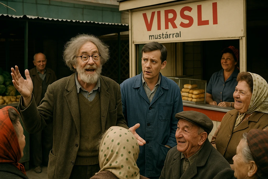 – Na jól van, mára ennyi elég lesz. Menjen vissza mindenki a dolgára, mielőtt még szimatot kapnak a belügyesek – mondta Kati néni, és letett a cimborák elé két virslit, mustárral, zsemlével.