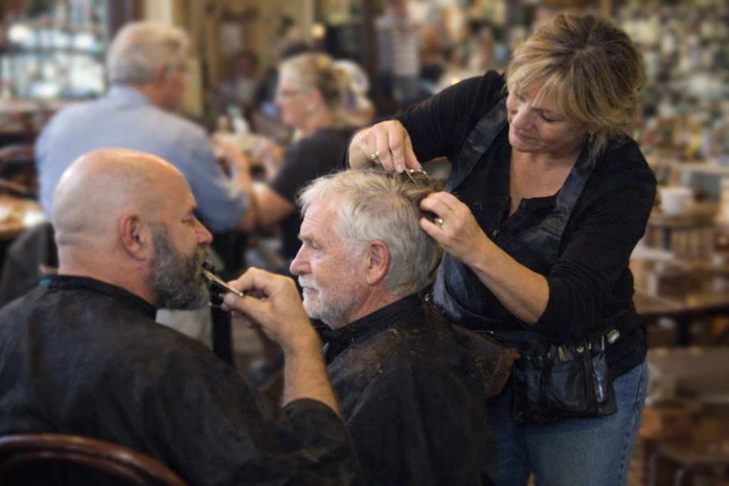 A kávéház halk zsongásába élesen hasított bele a bejárati ajtó feletti csengő hangja. Minden fej a belépő felé fordult, aki egy kis kerekes asztalkát tolt maga előtt, a rajta lévő holmikat egy fehér lepellel letakarva. Lassan az egyedül üldögélő Zsófikához sétált, a túloldalon élő vénkisasszonyhoz, és a lepel alól kihúzott valami rongyot, amiről kiderült, hogy egy hajvágó kendő, amit Zsófika nyaka köré penderített. A kezébe kapott egy ollót, villámgyors mozdulatokkal tinis frizurát vágott a vénkisasszonynak. Utána átlebbent a szomszéd asztalnál ülő hölgyekhez, akiknek csavarókkal alakította a haját, s amíg száradtak, megnyírta a három férfivendéget – egynek, aki kopasz volt, csak a szakállát tette rendbe. Miután minden fej szinte megújult, kért egy kávét és a csészét félkézzel egyensúlyozva kitolatott az ajtón.